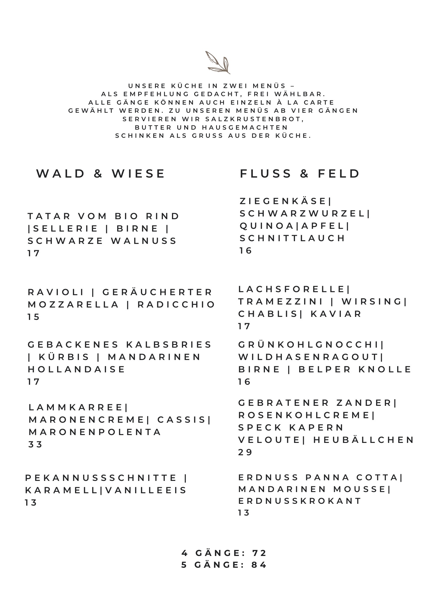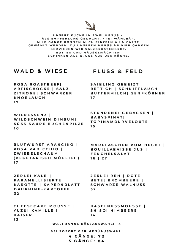 Für die Wintermonate laden wir euch ein, unsere Küche in zwei neuen Menüs zu entdecken: Wald & Wiese und Fluss & Feld. Ihr könnt die Menüs komplett genießen oder euch - wie gewohnt - einzelne Gänge ganz normal á la carte auswählen. Sonntag Mittag gibts wie gewohnt eine á la carte Karte mit Klassikern wie Schweinekrustenbraten.