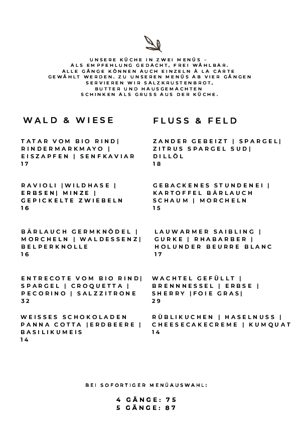 Wir laden euch ein, unsere Küche in zwei Menüs zu entdecken: Wald & Wiese und Fluss & Feld. Ihr könnt die Menüs komplett genießen oder euch - wie gewohnt - einzelne Gänge ganz normal á la carte auswählen. Sonntag Mittag gibts wie gewohnt eine á la carte Karte mit Klassikern wie Schweinekrustenbraten.